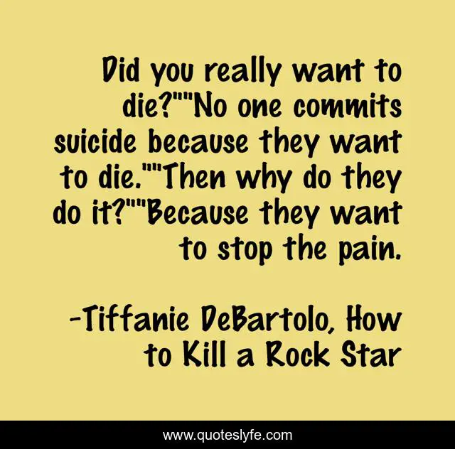 This page presents the quote "Did you really want to die?""No one commits suicide because they want to die.""Then why do they do it?""Because they want to stop the pain.". Author of this quote is Tiffanie DeBartolo, How to Kill a Rock Star. This quote is about intent, suicide, pain,.