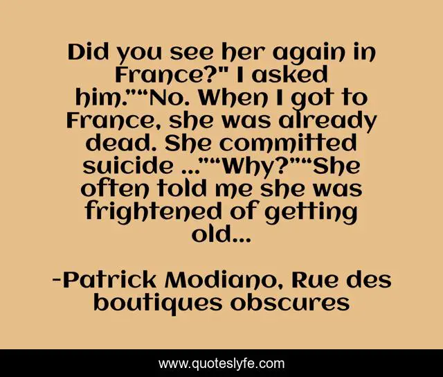 This page presents the quote "Did you see her again in France?" I asked him.”“No. When I got to France, she was already dead. She committed suicide ...”“Why?”“She often told me she was frightened of getting old...". Author of this quote is Patrick Modiano, Rue des boutiques obscures. This quote is about death, suicide, fright,.