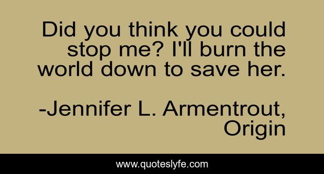 This page presents the quote "Did you think you could stop me? I'll burn the world down to save her.". Author of this quote is Jennifer L. Armentrout, Origin. This quote is about love, katy-swartz, daemon-black, daemon-black-pov, katy-and-daemon, affection,.