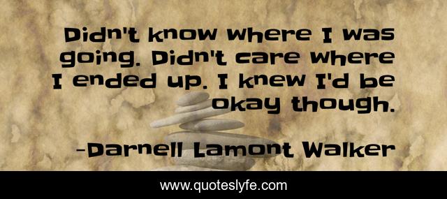 This page presents the quote "Didn't know where I was going. Didn't care where I ended up. I knew I'd be okay though.". Author of this quote is Darnell Lamont Walker. This quote is about living, life, destination, success, wanderlust, freedom, travel, going-places, traveling,.