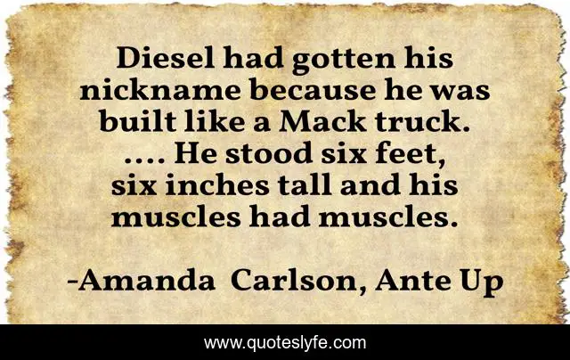 This page presents the quote "Diesel had gotten his nickname because he was built like a Mack truck. .... He stood six feet, six inches tall and his muscles had muscles.". Author of this quote is Amanda Carlson, Ante Up. This quote is about werewolves, paranormal-romance, witches,.
