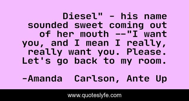 This page presents the quote "Diesel" - his name sounded sweet coming out of her mouth --"I want you, and I mean I really, really want you. Please. Let's go back to my room.". Author of this quote is Amanda Carlson, Ante Up. This quote is about las-vegas, urban-fantasy-romance, paranormal-romance, witches, werewolves,.