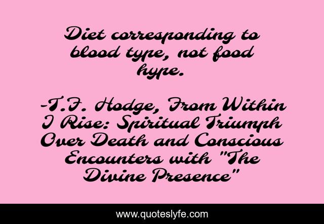 "T.F. Hodge, From Within I Rise: Spiritual Triumph Over Death and Conscious Encounters with "The Divine Presence" Quotes." Quoteslyfe.com, 2025. Sat. 06 Dec. 2025. <https://www.quoteslyfe.com/quote/Diet-corresponding-to-blood-type-not-food-211882>.