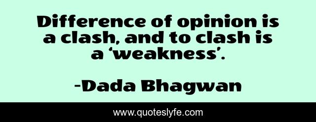 This page presents the quote "Difference of opinion is a clash, and to clash is a ‘weakness’.". Author of this quote is Dada Bhagwan. This quote is about opinions, spiritual, clash, weakness, weaknesses, clashes, difference-of-opinion,.