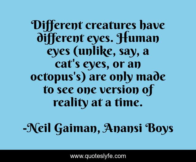 This page presents the quote "Different creatures have different eyes. Human eyes (unlike, say, a cat's eyes, or an octopus's) are only made to see one version of reality at a time.". Author of this quote is Neil Gaiman, Anansi Boys. This quote is about perception, reality,.
