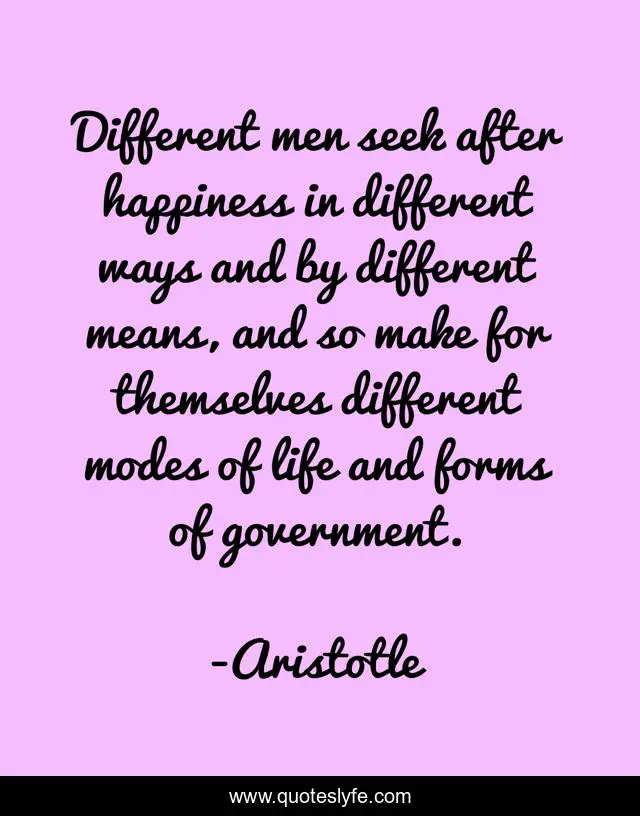 This page presents the quote "Different men seek after happiness in different ways and by different means, and so make for themselves different modes of life and forms of government.". Author of this quote is Aristotle. This quote is about life, men, government,.