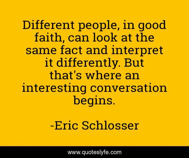 This page presents the quote "Different people, in good faith, can look at the same fact and interpret it differently. But that's where an interesting conversation begins.". Author of this quote is Eric Schlosser. This quote is about conversation, good, people,.