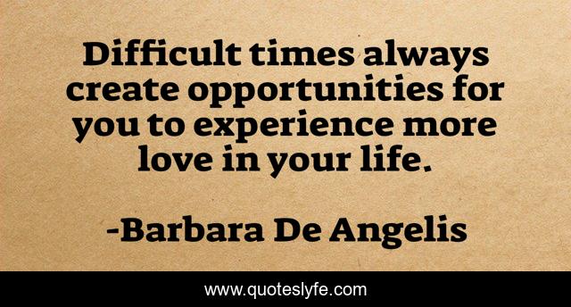 This page presents the quote "Difficult times always create opportunities for you to experience more love in your life.". Author of this quote is Barbara De Angelis. This quote is about life, love, opportunities, affection,.