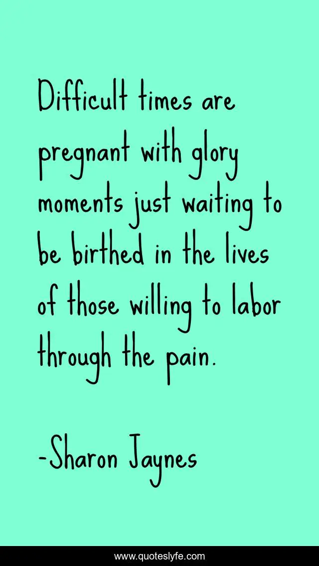 This page presents the quote "Difficult times are pregnant with glory moments just waiting to be birthed in the lives of those willing to labor through the pain.". Author of this quote is Sharon Jaynes. This quote is about faith, trust, hope, patience,.
