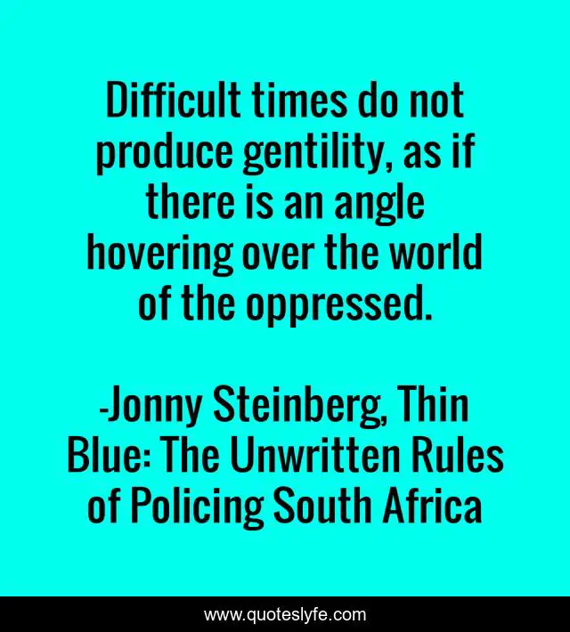 This page presents the quote "Difficult times do not produce gentility, as if there is an angle hovering over the world of the oppressed.". Author of this quote is Jonny Steinberg, Thin Blue: The Unwritten Rules of Policing South Africa. This quote is about apartheid, oppression, violence,.