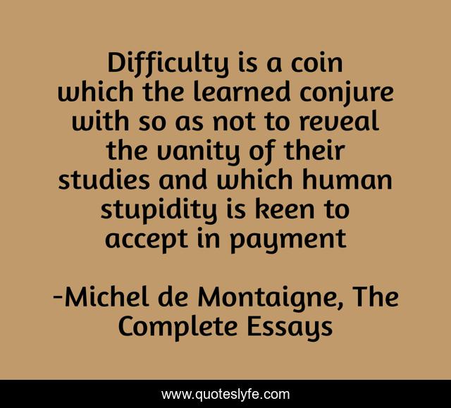 This page presents the quote "Difficulty is a coin which the learned conjure with so as not to reveal the vanity of their studies and which human stupidity is keen to accept in payment". Author of this quote is Michel de Montaigne, The Complete Essays. This quote is about deceit, pretension, vanity,.