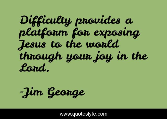 This page presents the quote "Difficulty provides a platform for exposing Jesus to the world through your joy in the Lord.". Author of this quote is Jim George. This quote is about difficulty, chirstian, joy, jim-george, lord,.