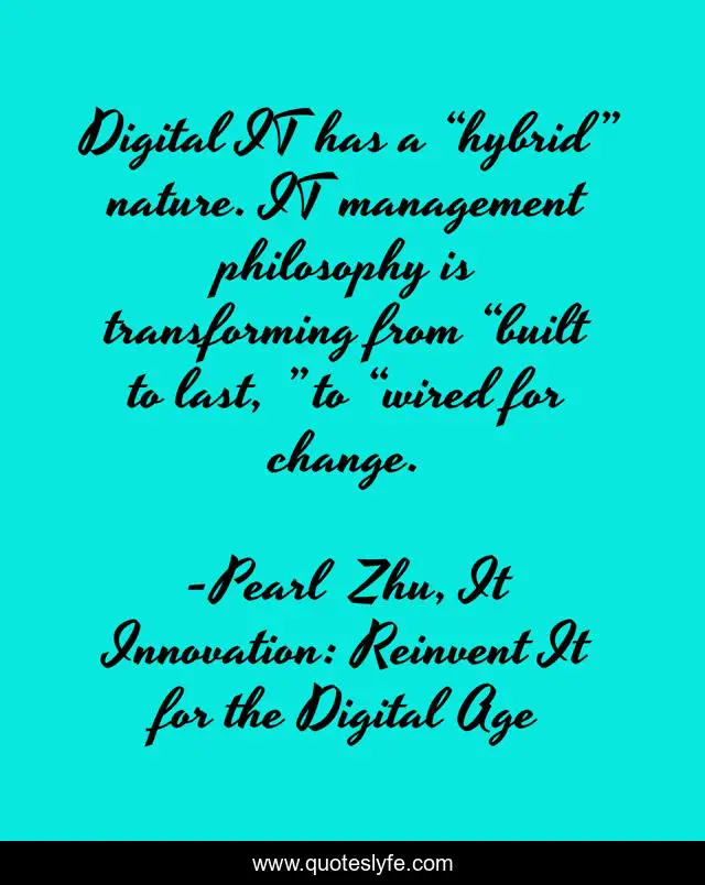 "Pearl Zhu, It Innovation: Reinvent It for the Digital Age Quotes." Quoteslyfe.com, 2025. Mon. 08 Dec. 2025. <https://www.quoteslyfe.com/quote/Digital-IT-has-a-hybrid-nature-IT-219790>.