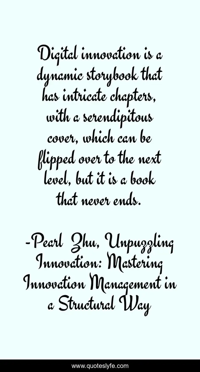 This page presents the quote "Digital innovation is a dynamic storybook that has intricate chapters, with a serendipitous cover, which can be flipped over to the next level, but it is a book that never ends.". Author of this quote is Pearl Zhu, Unpuzzling Innovation: Mastering Innovation Management in a Structural Way. This quote is about creativity, innovation,.