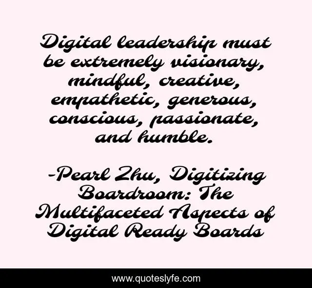 This page presents the quote "Digital leadership must be extremely visionary, mindful, creative, empathetic, generous, conscious, passionate, and humble.". Author of this quote is Pearl Zhu, Digitizing Boardroom: The Multifaceted Aspects of Digital Ready Boards. This quote is about leadership, boards, digital,.