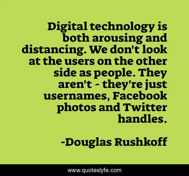 "Douglas Rushkoff Quotes." Quoteslyfe.com, 2025. Fri. 05 Dec. 2025. <https://www.quoteslyfe.com/quote/Digital-technology-is-both-arousing-and-distancing-319971>.
