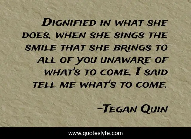 This page presents the quote "Dignified in what she does, when she sings the smile that she brings to all of you unaware of what's to come, I said tell me what's to come.". Author of this quote is Tegan Quin. This quote is about in-what-she-does, tegan-and-sara, superstar, sara-quin, tegan-quin, dignified, unaware-of-what-s-to-come, under-feet-like-ours, smile,.