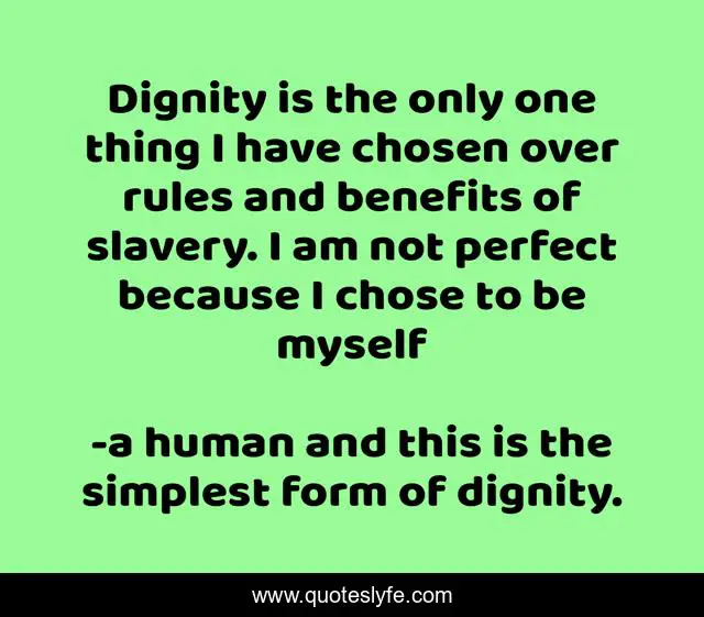 This page presents the quote "Dignity is the only one thing I have chosen over rules and benefits of slavery. I am not perfect because I chose to be myself". Author of this quote is a human and this is the simplest form of dignity.. .