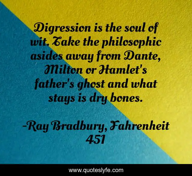 This page presents the quote "Digression is the soul of wit. Take the philosophic asides away from Dante, Milton or Hamlet's father's ghost and what stays is dry bones.". Author of this quote is Ray Bradbury, Fahrenheit 451. This quote is about digression, philosophy, writing, wit, censorship, reading,.