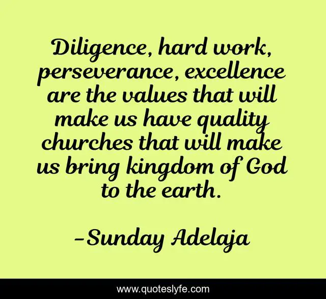 This page presents the quote "Diligence, hard work, perseverance, excellence are the values that will make us have quality churches that will make us bring kingdom of God to the earth.". Author of this quote is Sunday Adelaja. This quote is about perseverance, hard-work, diligence, kingdom-of-god, excellence, earth, values, churches, quality,.