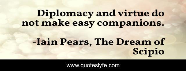 This page presents the quote "Diplomacy and virtue do not make easy companions.". Author of this quote is Iain Pears, The Dream of Scipio. This quote is about politics, virtue, diplomacy,.