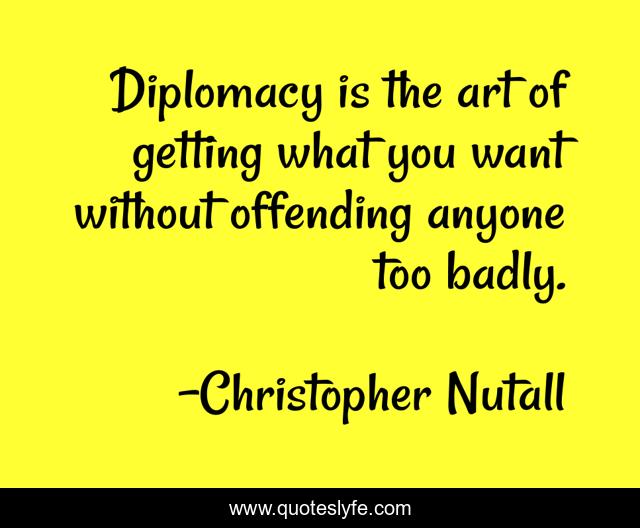 This page presents the quote "Diplomacy is the art of getting what you want without offending anyone too badly.". Author of this quote is Christopher Nutall. This quote is about negotiation, business, truth, diplomacy,.