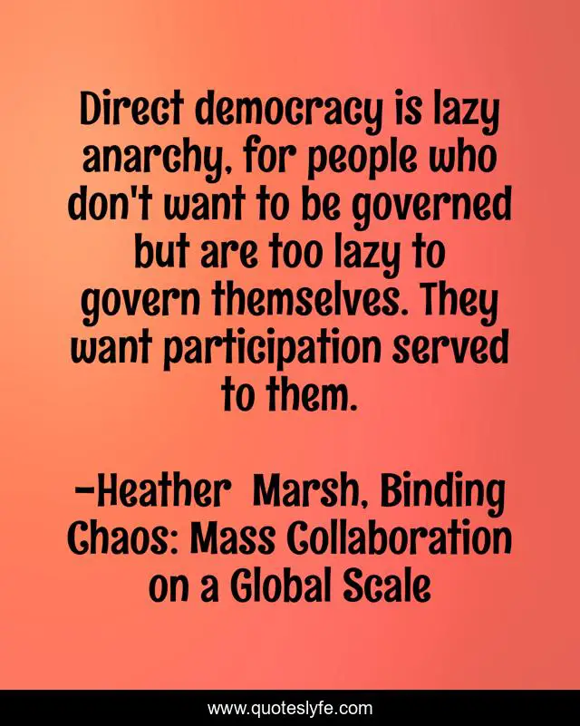"Heather Marsh, Binding Chaos: Mass Collaboration on a Global Scale Quotes." Quoteslyfe.com, 2025. Sat. 06 Dec. 2025. <https://www.quoteslyfe.com/quote/Direct-democracy-is-lazy-anarchy-for-people-51799>.