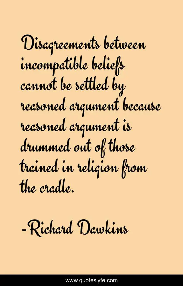 This page presents the quote "Disagreements between incompatible beliefs cannot be settled by reasoned argument because reasoned argument is drummed out of those trained in religion from the cradle.". Author of this quote is Richard Dawkins. This quote is about beliefs, argument, between,.