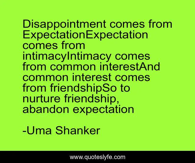 "Uma Shanker Quotes." Quoteslyfe.com, 2025. Fri. 05 Dec. 2025. <https://www.quoteslyfe.com/quote/Disappointment-comes-from-ExpectationExpectation-comes-from-intimacyIntimacy-50796>.