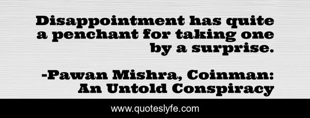 This page presents the quote "Disappointment has quite a penchant for taking one by a surprise.". Author of this quote is Pawan Mishra, Coinman: An Untold Conspiracy. This quote is about life, penchant, take-by-surprise, wisdom, disappointment, surprise,.