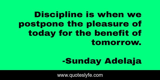 This page presents the quote "Discipline is when we postpone the pleasure of today for the benefit of tomorrow.". Author of this quote is Sunday Adelaja. This quote is about discipline, pleasure, benefit, postpone,.