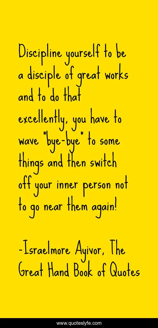 This page presents the quote "Discipline yourself to be a disciple of great works and to do that excellently, you have to wave "bye-bye" to some things and then switch off your inner person not to go near them again!". Author of this quote is Israelmore Ayivor, The Great Hand Book of Quotes. This quote is about conscience, discipline, great, inner-person, work, excel, great-work, good-work, wave,.