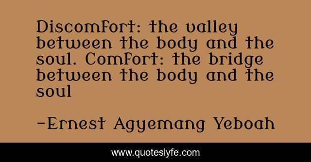 This page presents the quote "Discomfort: the valley between the body and the soul. Comfort: the bridge between the body and the soul". Author of this quote is Ernest Agyemang Yeboah. This quote is about comfort, joy, sorrow, comfortable-life, discomfort-with-self, joyful-living, discomfort, finding-comfort, perplexity,.