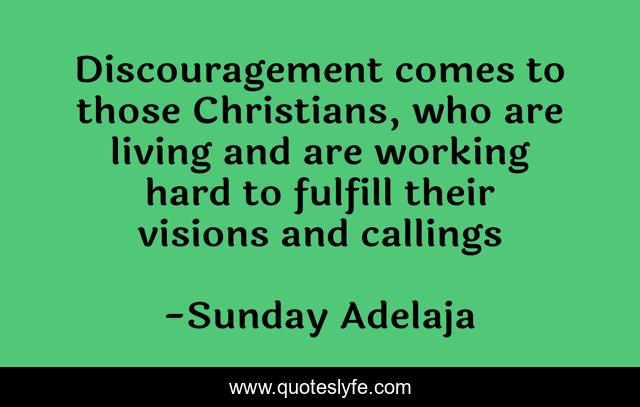This page presents the quote "Discouragement comes to those Christians, who are living and are working hard to fulfill their visions and callings". Author of this quote is Sunday Adelaja. This quote is about purpose, calling-fulfillment, life, goals,.