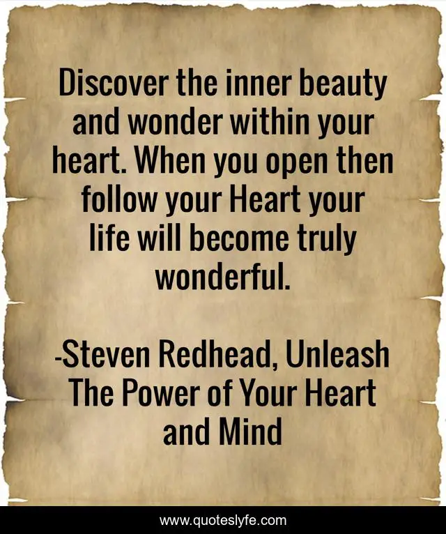 This page presents the quote "Discover the inner beauty and wonder within your heart. When you open then follow your Heart your life will become truly wonderful.". Author of this quote is Steven Redhead, Unleash The Power of Your Heart and Mind. This quote is about heart, life, beauty, discover, wonderful, wonder,.