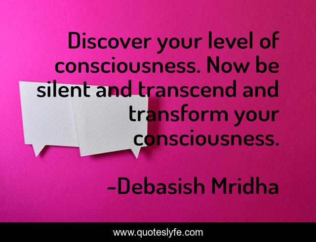 This page presents the quote "Discover your level of consciousness. Now be silent and transcend and transform your consciousness.". Author of this quote is Debasish Mridha. This quote is about consciousness, philosophy, debasish-mridha, be-silent, transform-your-consciousness, quotes, inspirational, enthusiasm, debasish-mridha-m-d,.