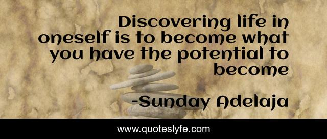 This page presents the quote "Discovering life in oneself is to become what you have the potential to become". Author of this quote is Sunday Adelaja. This quote is about life, oneself, calling, life-discovery, potential, purpose, truth, discovery,.