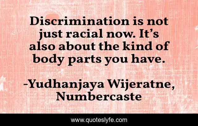 This page presents the quote "Discrimination is not just racial now. It’s also about the kind of body parts you have.". Author of this quote is Yudhanjaya Wijeratne, Numbercaste. This quote is about discrimination, life, racism, bodies, future-inspirational,.