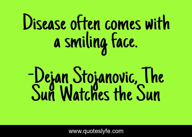 "Dejan Stojanovic, The Sun Watches the Sun Quotes." Quoteslyfe.com, 2025. Sat. 06 Dec. 2025. <https://www.quoteslyfe.com/quote/Disease-often-comes-with-a-smiling-face-112389>.