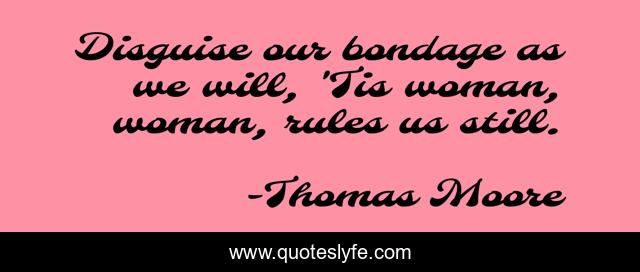 This page presents the quote "Disguise our bondage as we will, 'Tis woman, woman, rules us still.". Author of this quote is Thomas Moore. This quote is about rules, woman,.