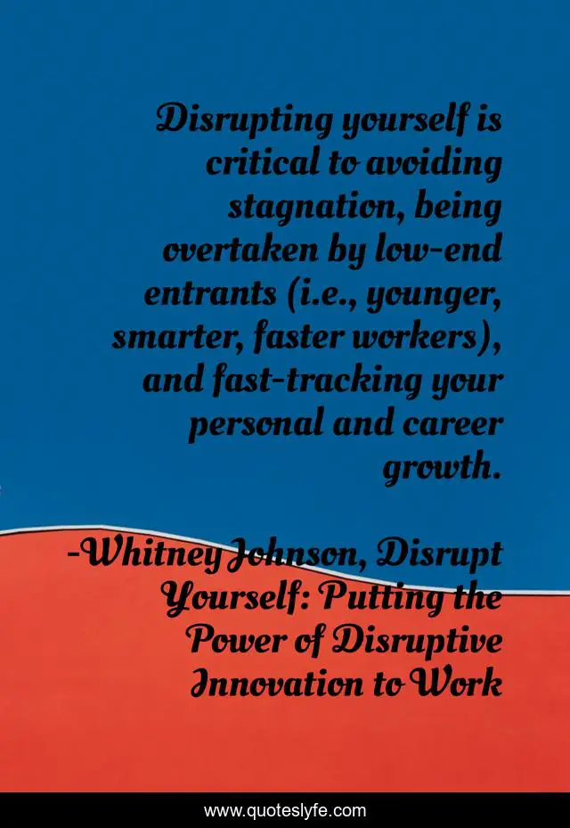 This page presents the quote "Disrupting yourself is critical to avoiding stagnation, being overtaken by low-end entrants (i.e., younger, smarter, faster workers), and fast-tracking your personal and career growth.". Author of this quote is Whitney Johnson, Disrupt Yourself: Putting the Power of Disruptive Innovation to Work. This quote is about career-goals, career-development, business, personal-growth,.