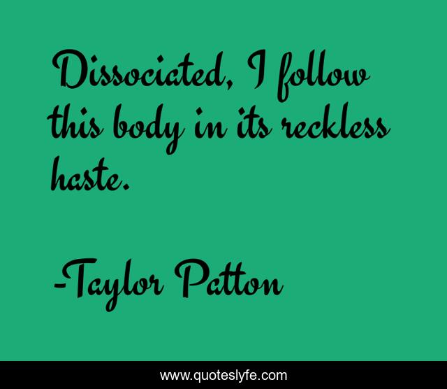 This page presents the quote "Dissociated, I follow this body in its reckless haste.". Author of this quote is Taylor Patton. This quote is about dissociated, love, poem, poetry, reckless, affection,.