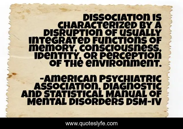"American Psychiatric Association, Diagnostic and Statistical Manual of Mental Disorders DSM-IV Quotes." Quoteslyfe.com, 2025. Fri. 05 Dec. 2025. <https://www.quoteslyfe.com/quote/Dissociation-is-characterized-by-a-disruption-of-103730>.