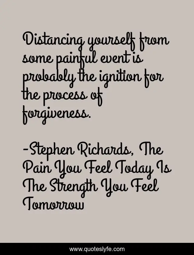 This page presents the quote "Distancing yourself from some painful event is probably the ignition for the process of forgiveness.". Author of this quote is Stephen Richards, The Pain You Feel Today Is The Strength You Feel Tomorrow. This quote is about empowering, confidence, moving-on-and-letting-go, healing-the-past, motivational, forgive, stephen-richards-author, stephen-richards, suffering,.