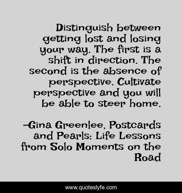 This page presents the quote "Distinguish between getting lost and losing your way. The first is a shift in direction. The second is the absence of perspective. Cultivate perspective and you will be able to steer home.". Author of this quote is Gina Greenlee, Postcards and Pearls: Life Lessons from Solo Moments on the Road. This quote is about inspriational, perspective-on-life, perspective,.