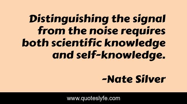 This page presents the quote "Distinguishing the signal from the noise requires both scientific knowledge and self-knowledge.". Author of this quote is Nate Silver. This quote is about noise, self-knowledge,.