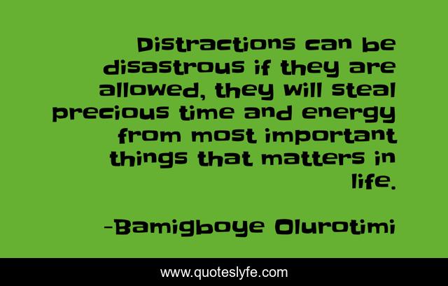 This page presents the quote "Distractions can be disastrous if they are allowed, they will steal precious time and energy from most important things that matters in life.". Author of this quote is Bamigboye Olurotimi. This quote is about life, disaster, decision, ignorance, procastination, choice, important, steal, energy,.