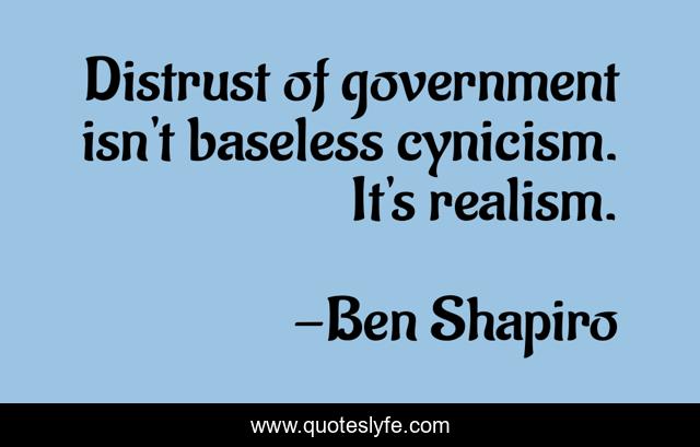 This page presents the quote "Distrust of government isn't baseless cynicism. It's realism.". Author of this quote is Ben Shapiro. This quote is about distrust, realism, cynicism,.
