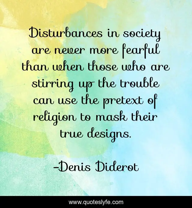 This page presents the quote "Disturbances in society are never more fearful than when those who are stirring up the trouble can use the pretext of religion to mask their true designs.". Author of this quote is Denis Diderot. This quote is about society, true, mask,.