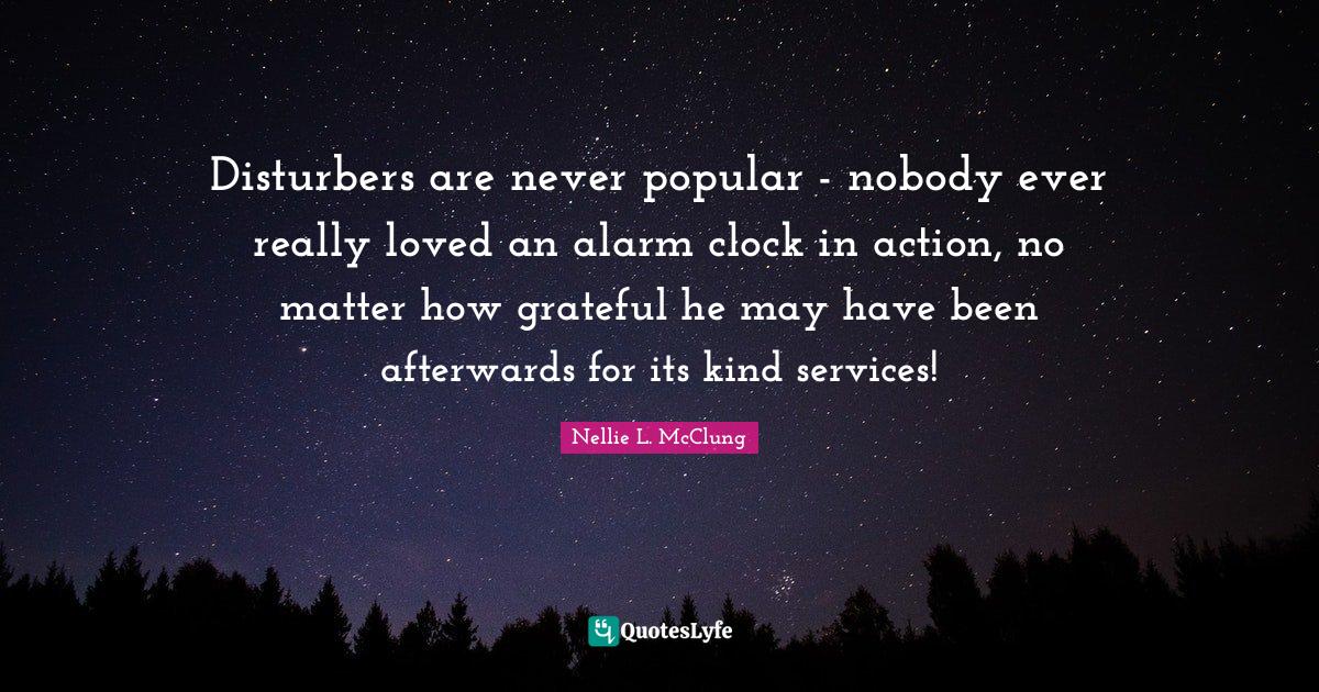 This page presents the quote "Disturbers are never popular - nobody ever really loved an alarm clock in action, no matter how grateful he may have been afterwards for its kind services!". Author of this quote is Nellie L. McClung. This quote is about action, matter, may, clock, alarms, grateful, kind,.